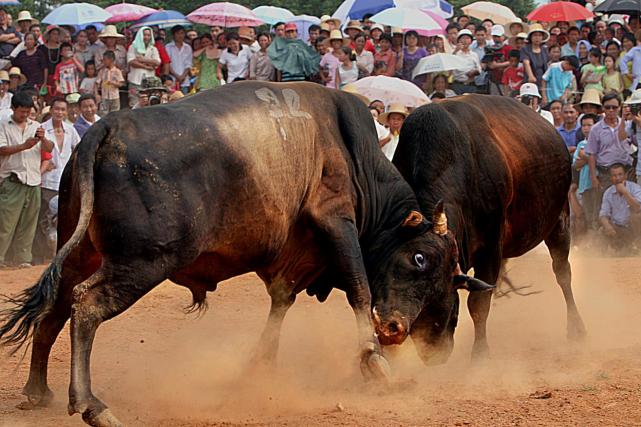 比赛时,两牛相对,放开牛绳,在牛主人的吆喝声下,两头大牛怒目圆睁,牛角相抵,双脚发力,拼命向对方顶去。双方时而进时而退,时而伫立凝视,瞅准对方的空隙突然发起进攻。斗牛全程惊险刺激,吊足了观众们绷紧的神经,稍有不慎,还可能处于斗牛攻击的危险中,看一场比赛下来,一会儿提心吊胆,一会儿心情澎湃,真是心情如过山车。
